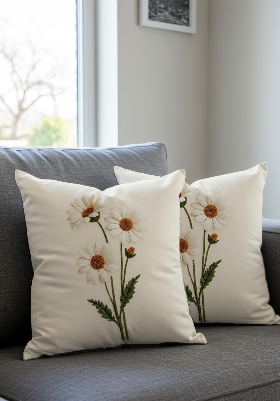 Artvibe Decorative Throw Pillow Covers with Embroidered Daisy Pattern, Italian Velvet Fabric, Hidden Zipper, Machine Washable, 2-Piece Set, Cream