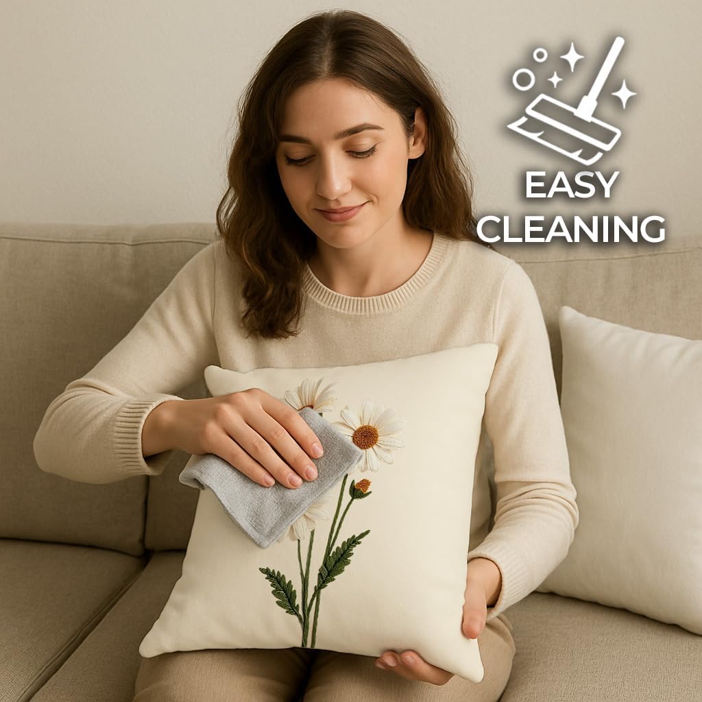 Transform your living space with these exquisite decorative throw pillow covers featuring a delicate daisy pattern. Crafted from premium Italian velvet fabric, each cover showcases stunning embroidered daisies against a cream background, creating an elegant botanical accent. The set includes two pillow covers with hidden zippers for a seamless look. The luxuriously soft velvet material offers both style and durability, while being stain-resistant and colorfast for easy maintenance. The covers feature the same high-quality velvet on both sides, with the back maintaining a clean, minimalist design. Machine washable at 30°C on a gentle cycle, these covers combine practicality with sophistication. Perfect for enhancing any room's decor, from living rooms to bedrooms, or even adding a touch of luxury to boats and yachts. The photo-quality digital printing ensures vibrant, long-lasting colors that won't fade. Note that inner pillows are sold separately, and actual colors may vary slightly from displayed images due to screen settings.