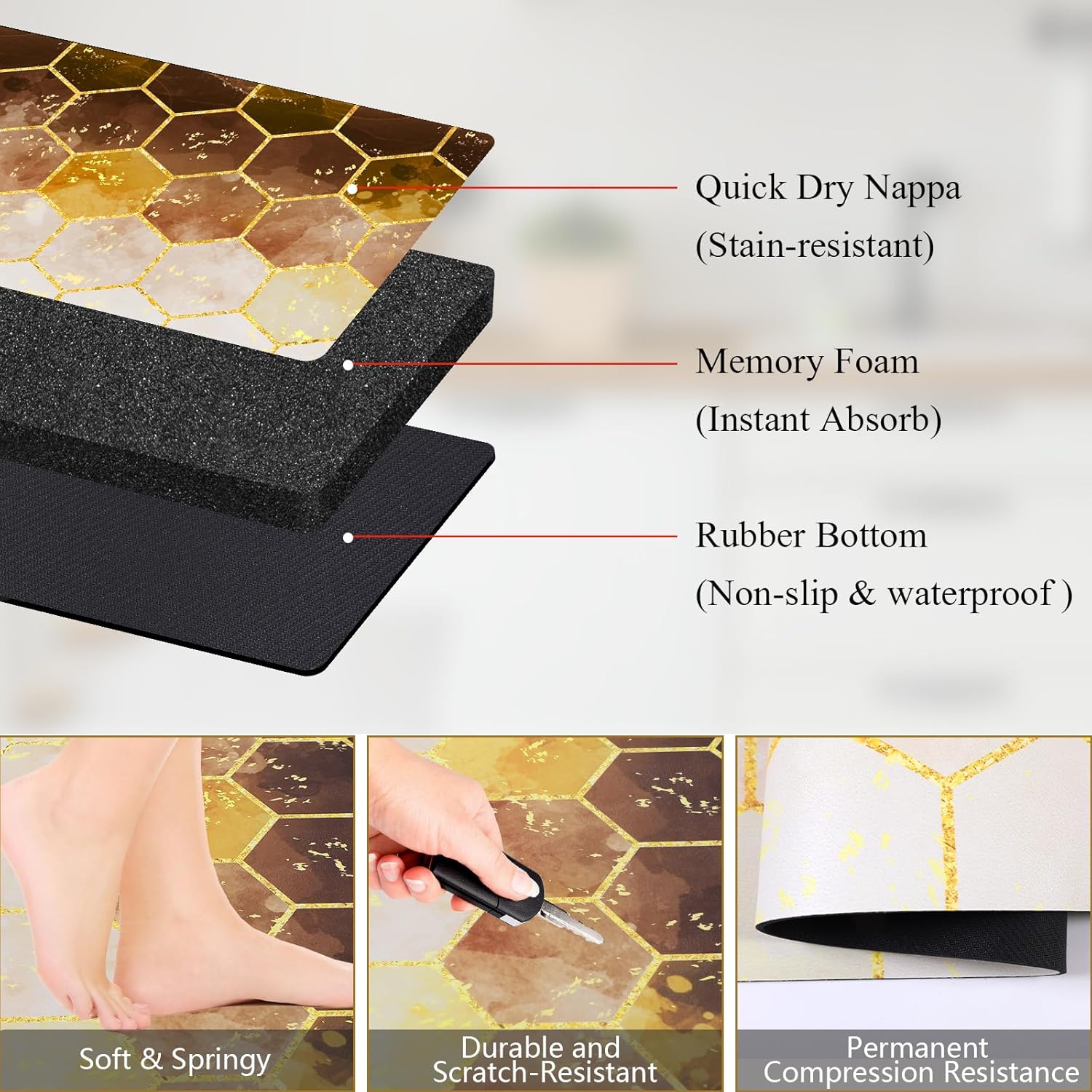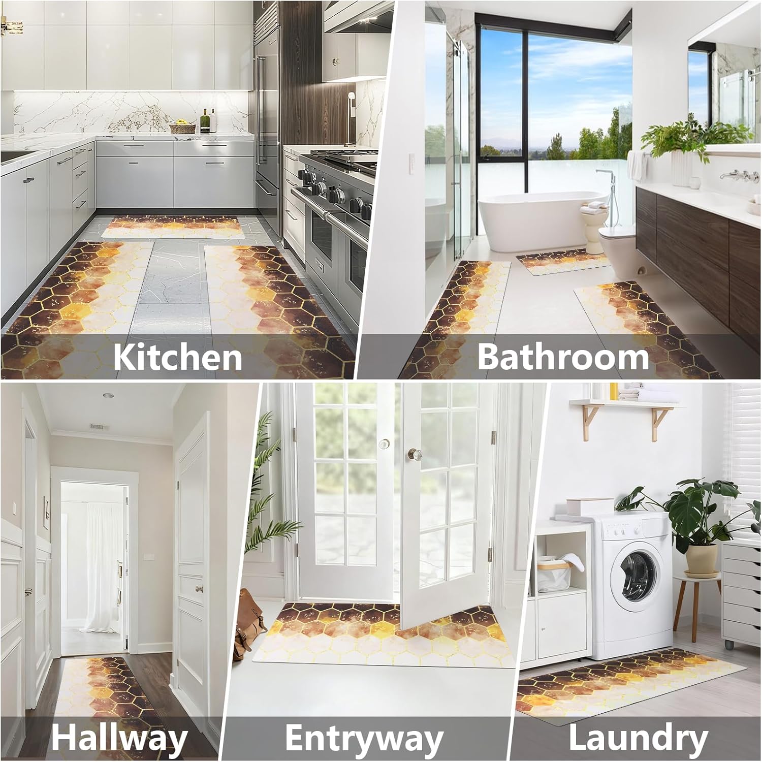 Kitchen Rugs Sets 3 Piece, Non Slip Cushioned Kitchen Mats for Floor Comfort Standing Runner Rugs, Chef Floor Carpet for Sink, Laundry Room, Hallway, Entryway, Bathroom, Brown Honeycomb Marble