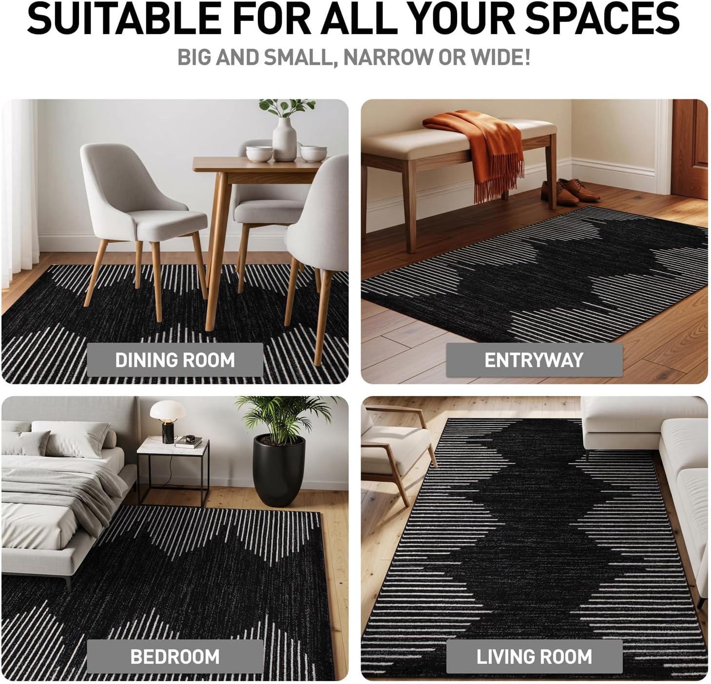 The rug's resilience against everyday wear makes it an ideal choice for lively households with kids and pets. It's specifically designed to withstand high traffic areas like living rooms, dining rooms, bedrooms, kitchens, hallways, and office spaces.